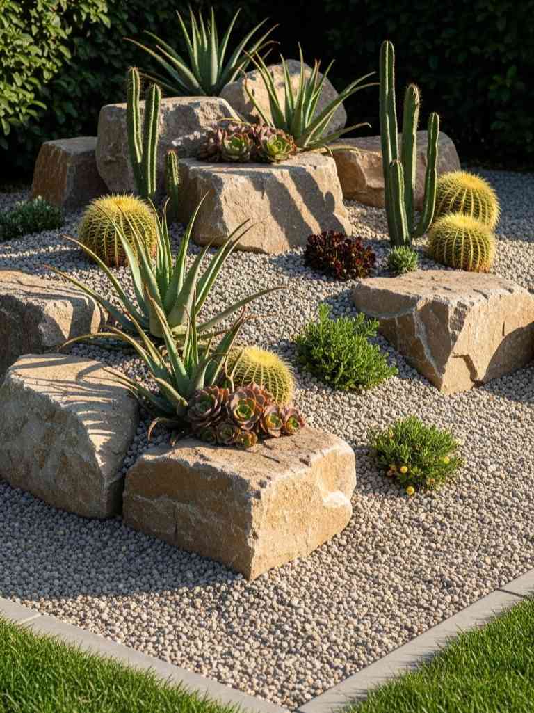 Add drought-tolerant plants like succulents, sedum, or small ornamental grasses. Their shapes look beautiful among the rocks.
