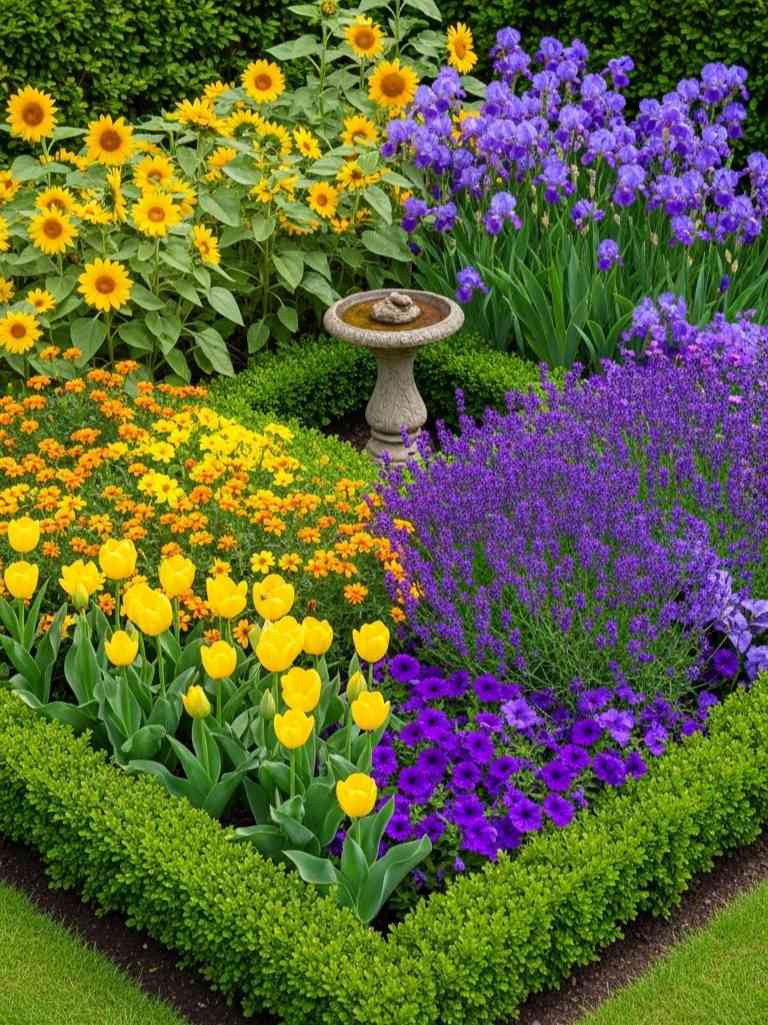 Use wood or stone to build the frame. Fill the bed with layered plants. Taller plants go at the back. Short flowers go at the front. Lavender, marigolds, and salvia look great together.