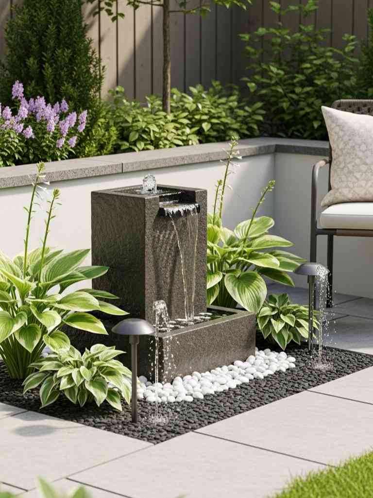 Choose a compact fountain made from stone or ceramic. Surround it with small plants like hostas or ornamental grasses. Their leaves move softly in the breeze.