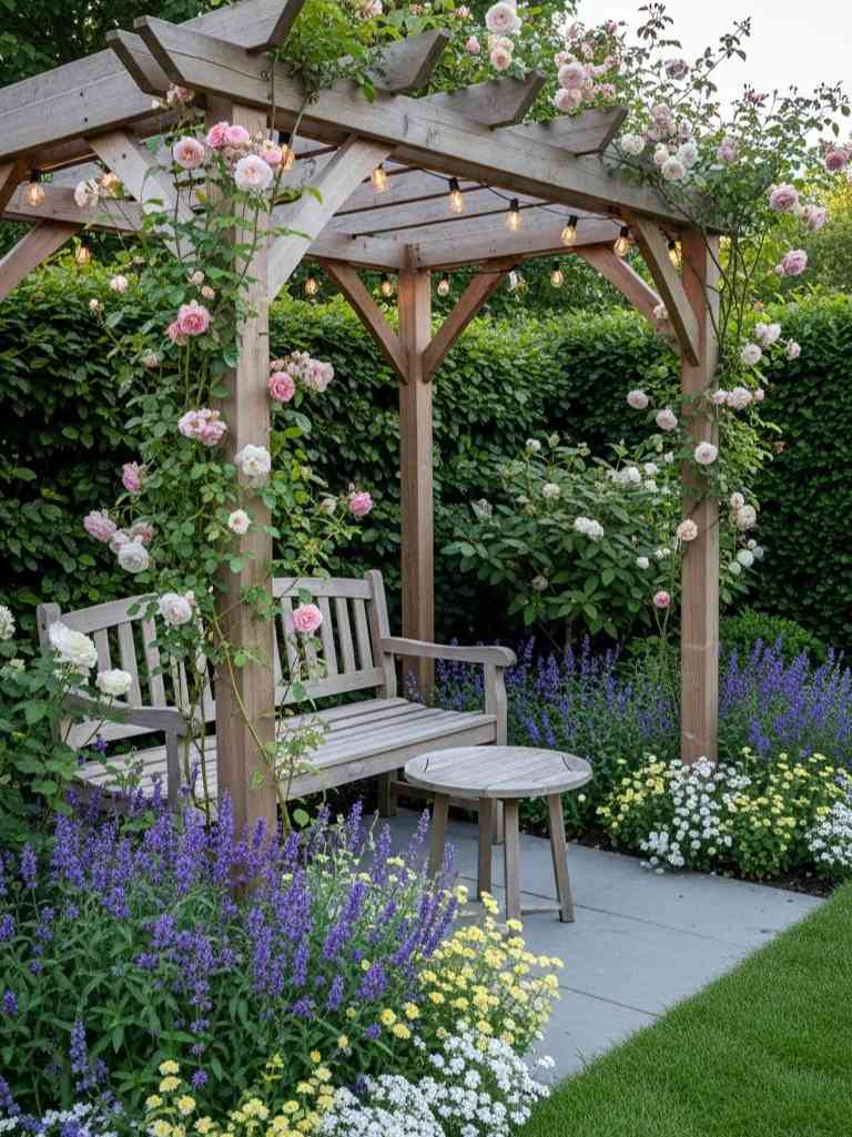 A mini pergola can turn a plain corner into something charming. I like using a small wooden pergola that fits neatly into the corner of the yard.