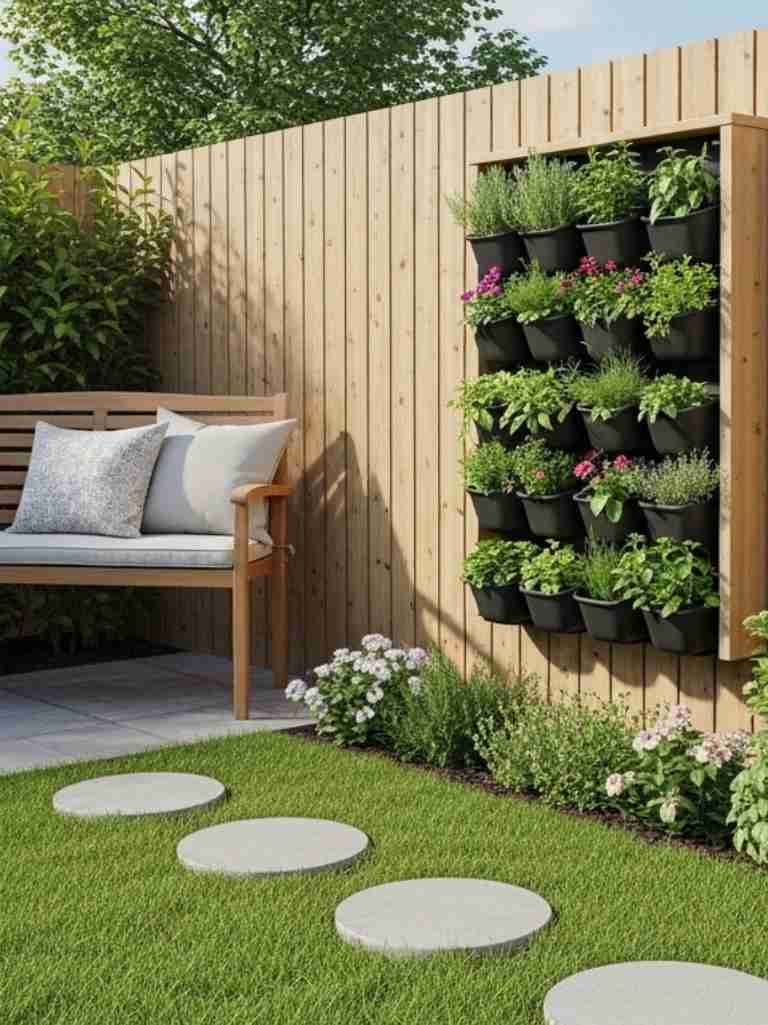 Attach wooden shelves, pocket planters, or metal frames to the fence. Then fill them with herbs, trailing plants, and flowers. Basil, mint, and thyme grow beautifully this way.