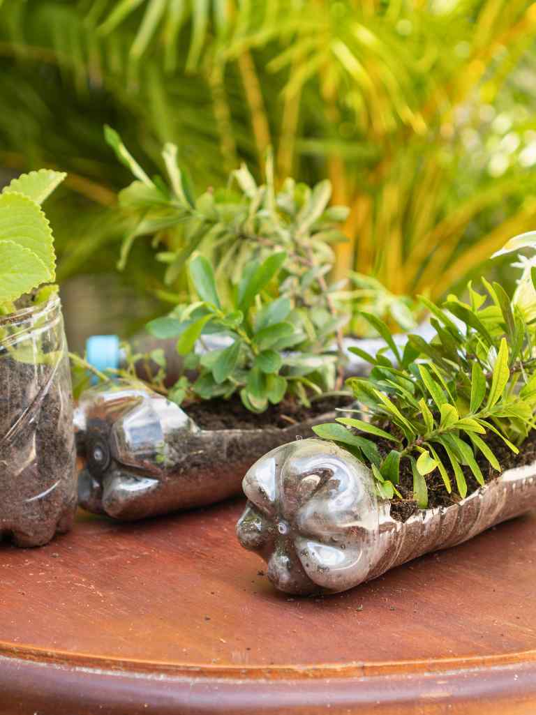 I once tried using plastic bottles, and I was surprised how pretty they looked. I cut them open, added soil, and hung them using rope along a corner wall. It instantly became one of my favorite vertical garden ideas.