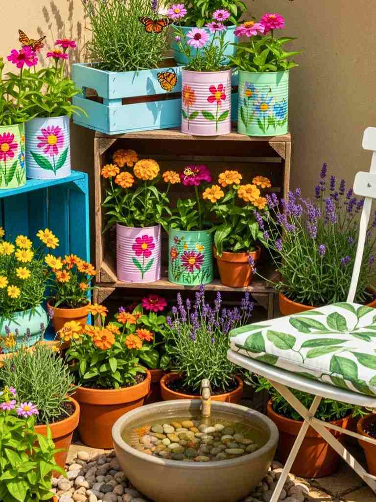 I always love turning a dull corner into something that actually feels alive, and this one does exactly that. I set up a small butterfly and pollinator corner using an old wooden crate stacked with reused tin cans and broken terracotta pots. I filled each layer with nectar-rich plants like marigolds, lavender, zinnia, and a few native wildflowers.