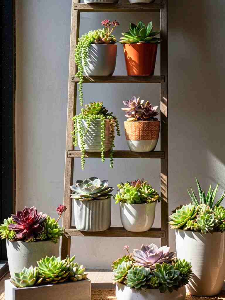 I like using an old ladder as a plant stand. I just lean it against the corner wall. Each step holds a few pots. It creates a vertical display without drilling anything.