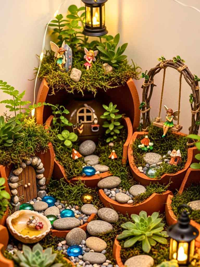 I accidentally broke one of my clay pots, and instead of throwing it away, I kept it. I arranged the broken pieces inside a bigger pot to create a tiny fairy garden. It turned out magical.