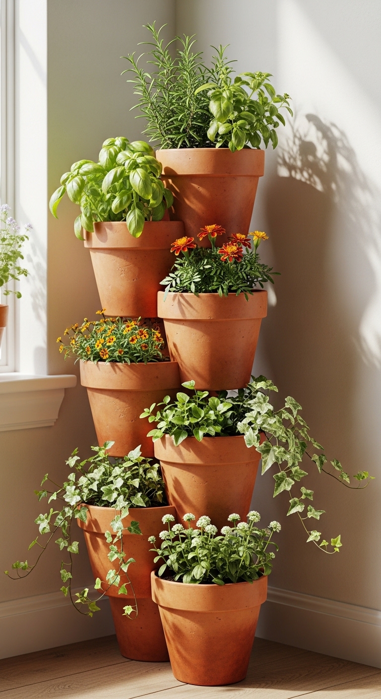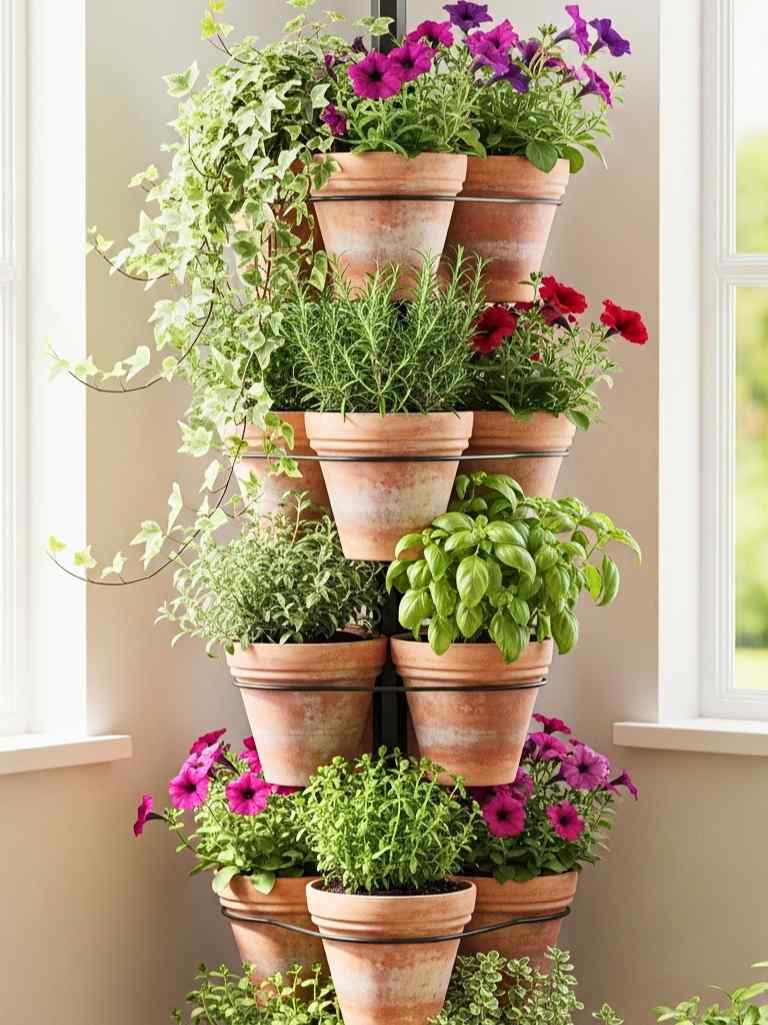 Each level had different plants. It added depth and interest to the corner. I like this idea because it uses vertical space without needing walls. It fits perfectly into small areas. You can grow herbs, flowers, or even small vegetables. It’s simple but very effective.