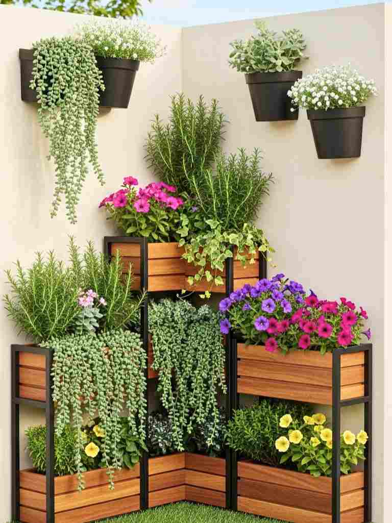 This idea adds depth without clutter. It’s perfect for balconies or patios. And it makes the corner feel fuller without crowding it.