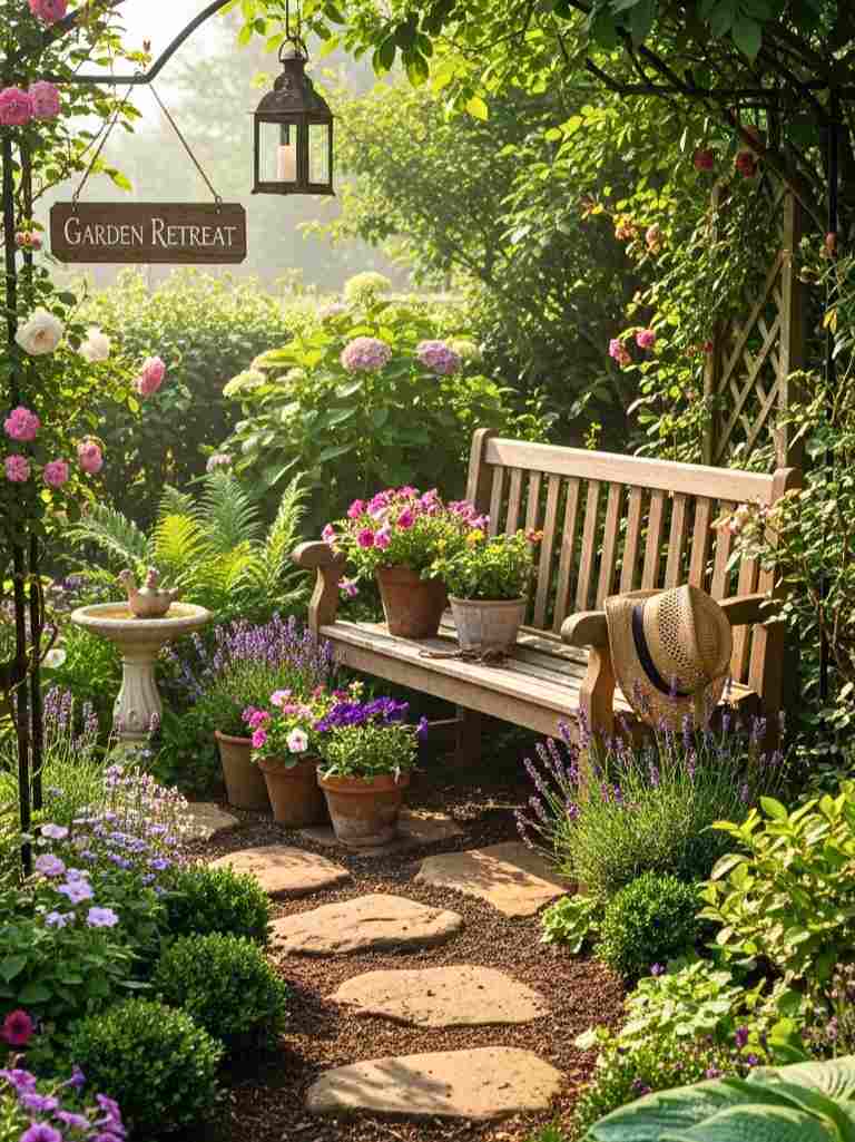 We all need a quiet spot sometimes. A cozy corner garden nook with a bench and greenery does exactly that. Add a small wooden bench or even a chair you already have.