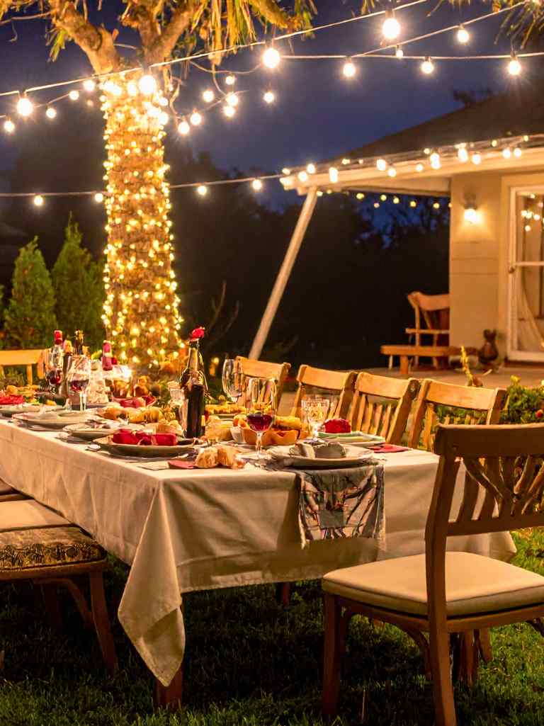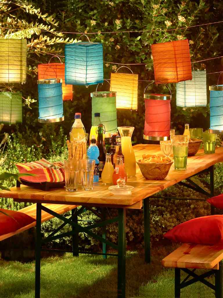 I suspend paper or metal lanterns from tree branches or poles. When night falls, their warm glow creates magic.