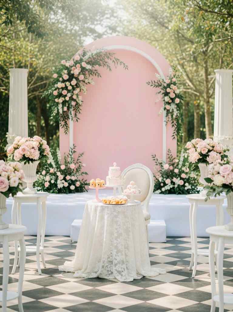 I bring in a rustic wooden table for cupcakes, snacks, or tiny gifts. Add potted plants along the edges.