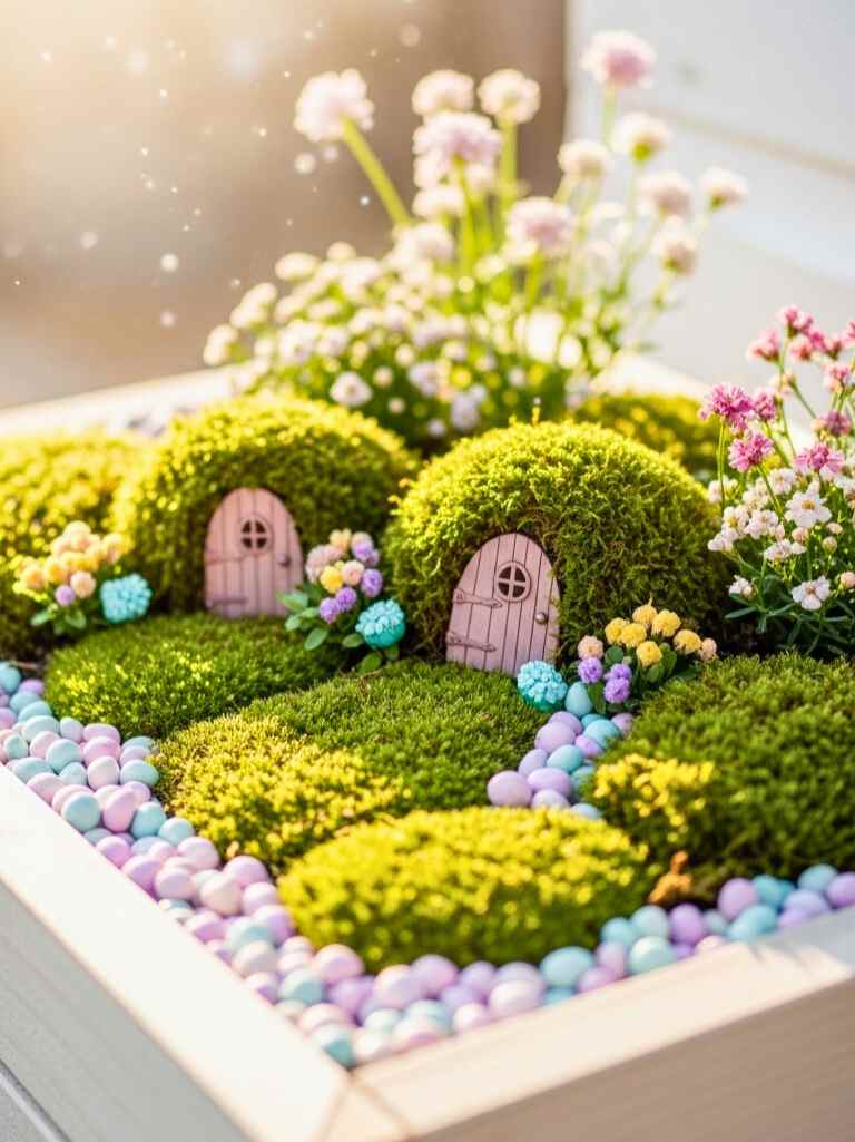 I love starting with a Raised bed fairy garden because it keeps things neat and exciting at the same time. A wooden raised bed makes planting easier for small hands. Kids can grow tiny flowers like alyssum, moss, and mini ferns. Then we add little fairy doors, pebbles, and colorful stones.