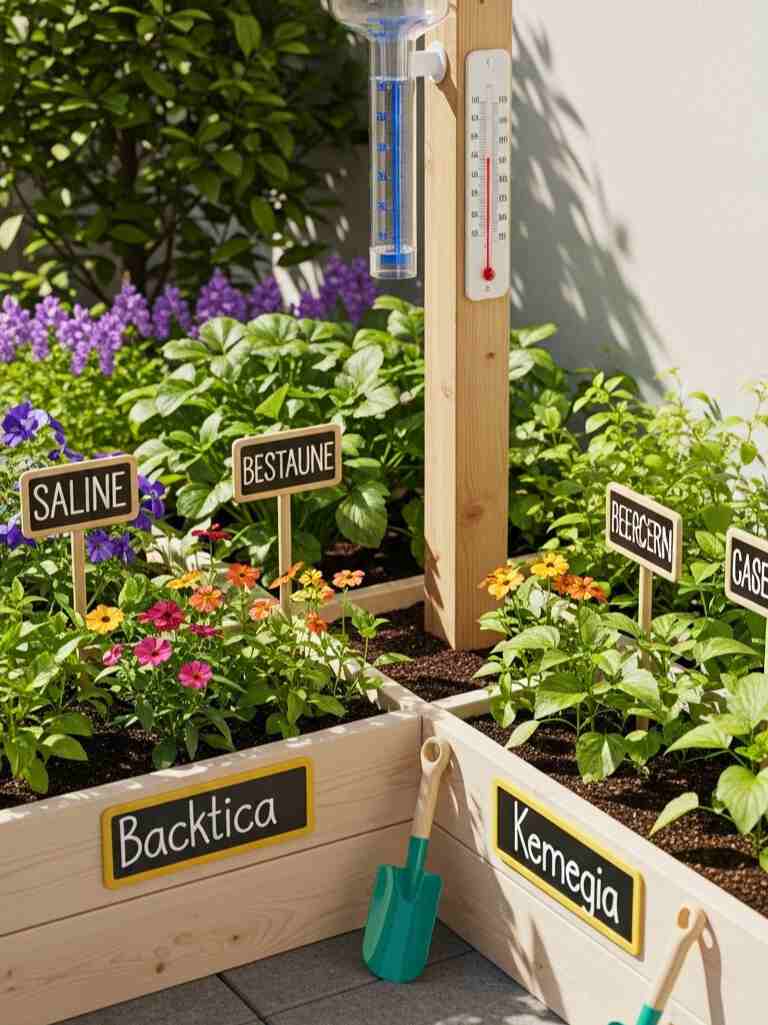 I set up a tiny weather station in one garden corner. It sounds fancy, but it’s simple. I hang a rain gauge and place a thermometer on a wooden post.