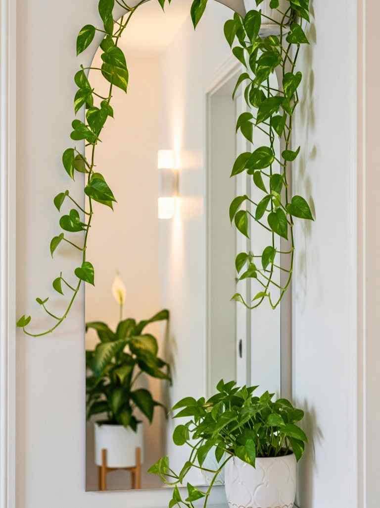 I placed a mirror at a hallway corner and let pothos grow around its edges. That simple move made the narrow space feel wider. You can guide vines along mirror frame or wall hooks so they form a soft green outline. It reflects light and greenery together, which feels refreshing every time someone walks past. Even a dull hallway becomes a small moment of beauty. It’s like the plant quietly greets everyone without saying a word.