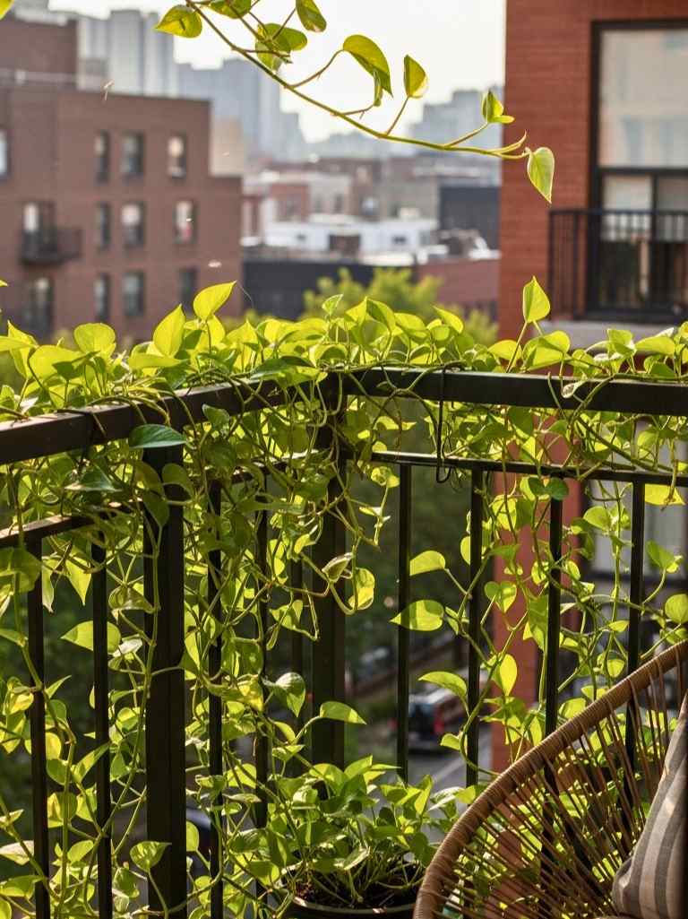 I once let pothos trail along a balcony corner railing, and it turned plain metal into something soft and living. You can guide vines around railing edges so they hang and climb freely. Outdoor light helps growth stay strong.