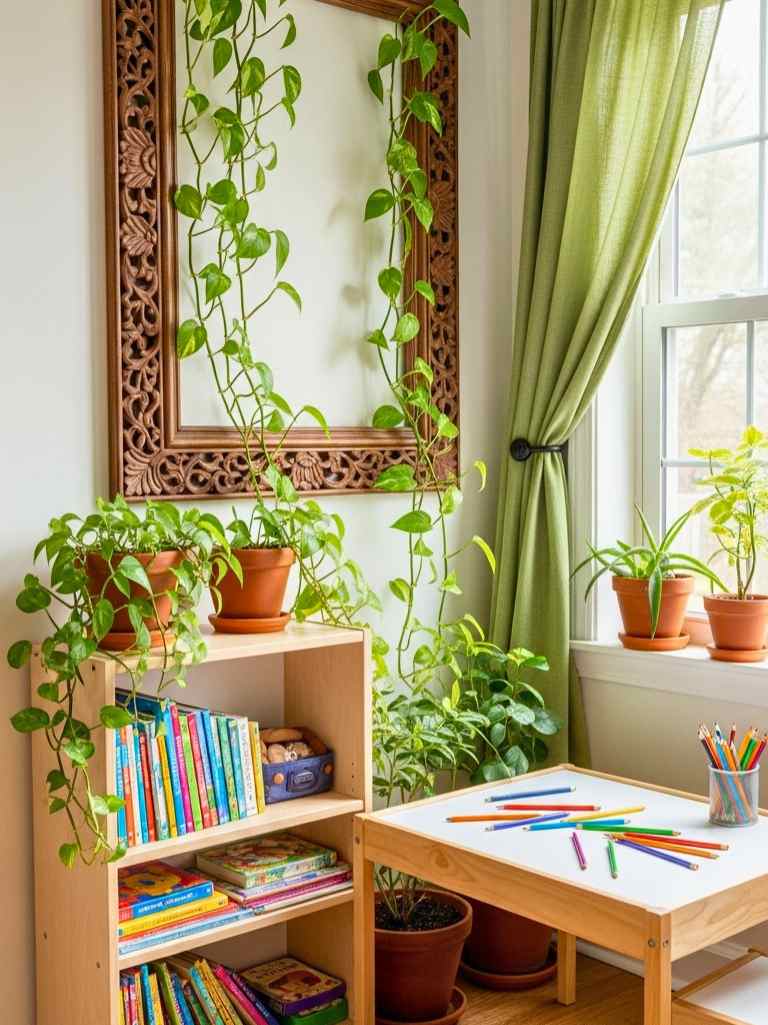 I once set up a small plant corner for my niece, and she started calling it her “green classroom.” That moment stuck with me. You can place pothos near a low shelf where kids keep books or craft items. Guide vines along a small wall frame so it grows around their space gently.