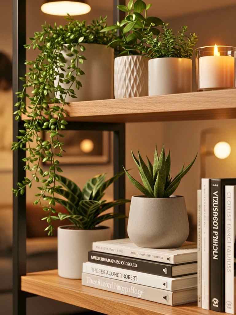 I added a pothos pot near my study desk corner during late-night work phases, and it surprisingly helped mood feel lighter. You can guide vines along a small wall frame beside shelves or desk lamp.