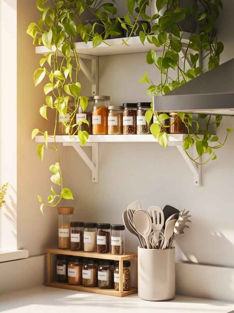 I enjoy mixing useful plants with beauty, so I tried pothos near my kitchen corner shelf. You can guide vines above spice racks or near hanging utensils. The plant softens the sharp look of kitchen items.