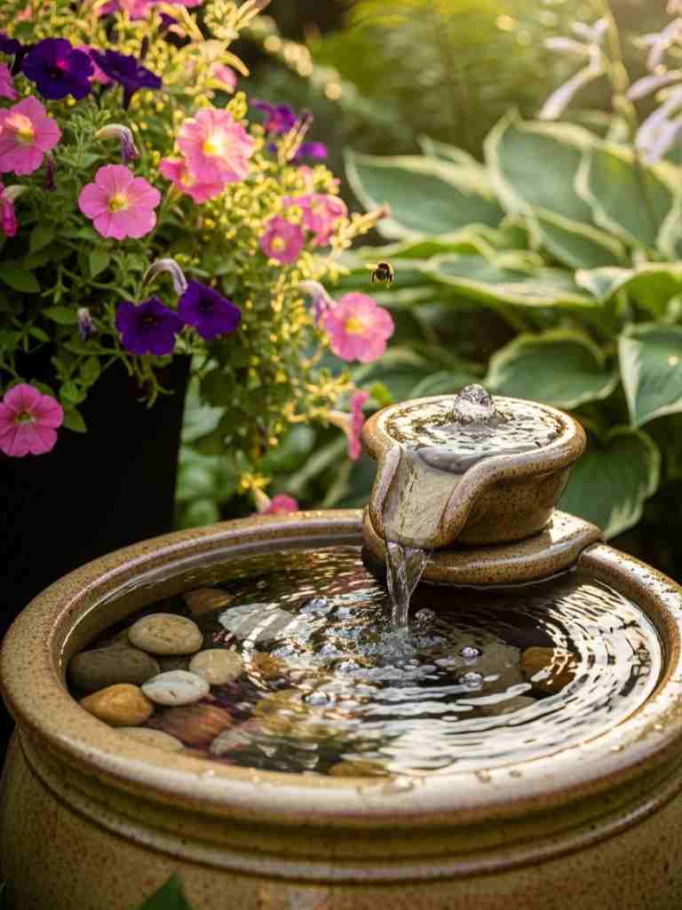 Water adds life to a garden. I once made a tiny fountain using a large ceramic pot and a small water pump. The sound of trickling water instantly made the garden peaceful.