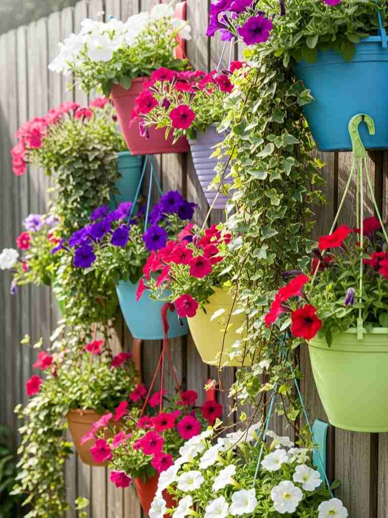Choose trailing flowers like petunias or ivy. They spill over the pots and create a soft look. This idea also connects nicely with vertical garden DIY ideas because it uses wall space creatively. I sometimes paint the pots bright colors. The contrast against a wooden fence looks beautiful. It’s an easy weekend project that adds color without taking up ground space.