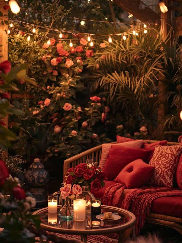 Create a picnic-style setup using rugs, throws, and low trays. Add candles or solar lights. Use heart decorations sparingly. Bring plants closer to seating. This style feels relaxed and youthful. It fits couples who love simplicity. Capture candid Valentine’s Day images. This setup works great for a Valentine’s Day post that feels real, not staged.