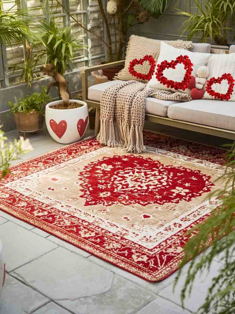 Add matching cushions or throws on seating. Use minimal heart decorations to keep things elegant. This idea looks stunning during daylight. It fits Pinterest boards focused on Valentine’s Day aesthetic. It also works well for small balconies. A simple table with candles finishes the look. This style feels fresh, romantic, and photo-ready without effort.