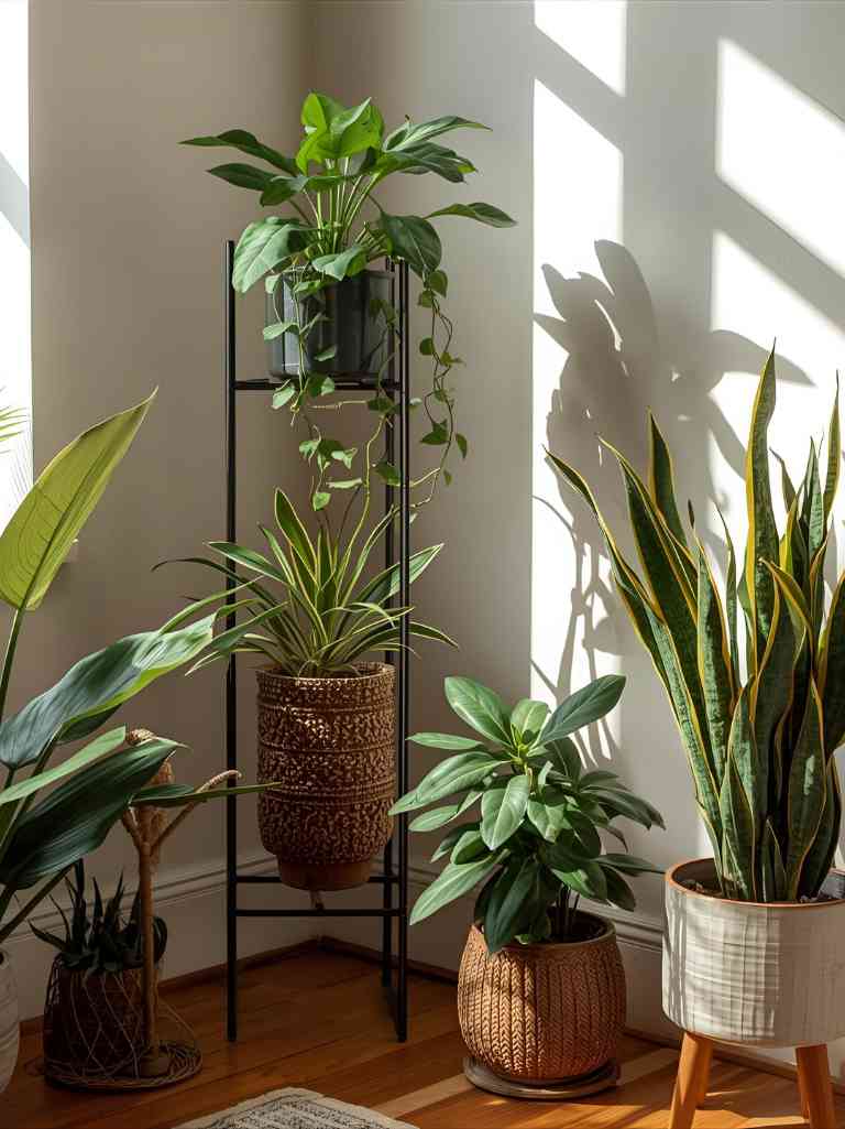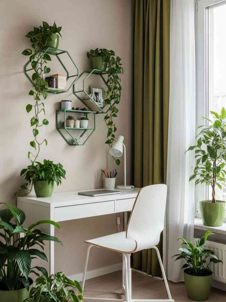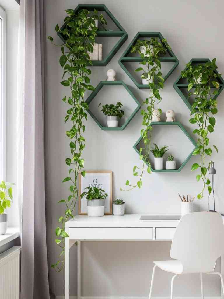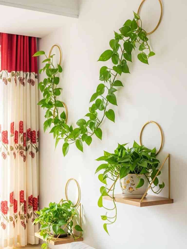 Start with a pothos on a floating shelf or plant stand. Then guide the vines across the wall using tiny hooks. I usually create soft curves instead of straight lines. The vine starts looking like natural wall art.