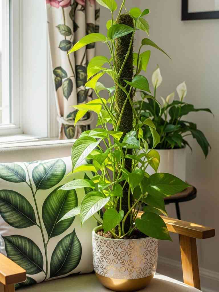 A moss pole makes pothos look tall and elegant. I always recommend this when someone wants a clean indoor pothos climbing setup. Place a medium pot beside a sofa or reading chair. Push a moss pole into the soil. Now guide the vines upward.