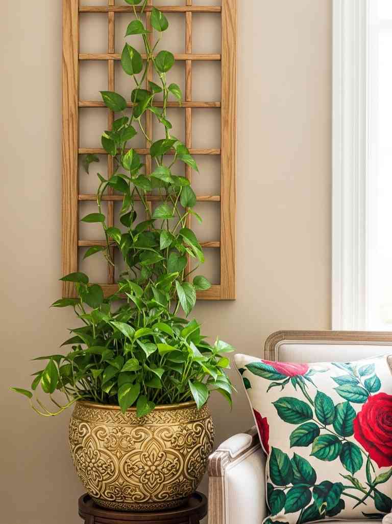 A small indoor trellis can transform a pothos into a decorative feature. I like placing a wooden trellis behind the pot. The plant then climbs like it would outdoors.