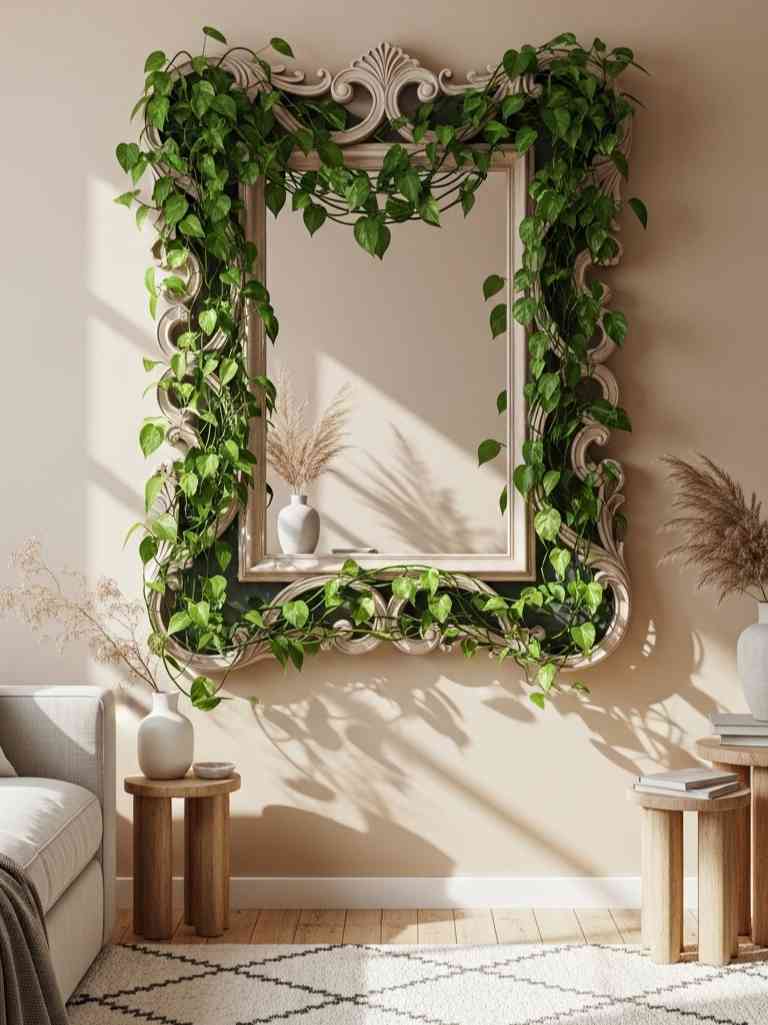 You only need a few discreet hooks around the mirror edges. Guide the vines slowly along the frame. Soon the mirror looks wrapped with greenery.