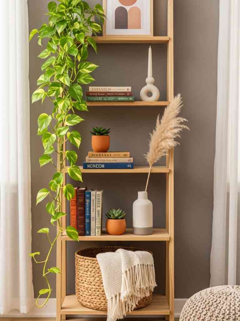A ladder shelf creates natural climbing steps. I place a pothos pot on the bottom level. Then I help the vines climb each shelf rung.