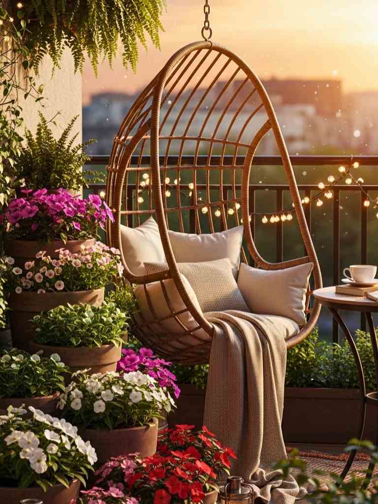 I once added a swing chair in my terrace corner, and I still thank myself for it. It became my go-to spot after long days. You can hang a single swing chair or use a stand if drilling isn’t possible.