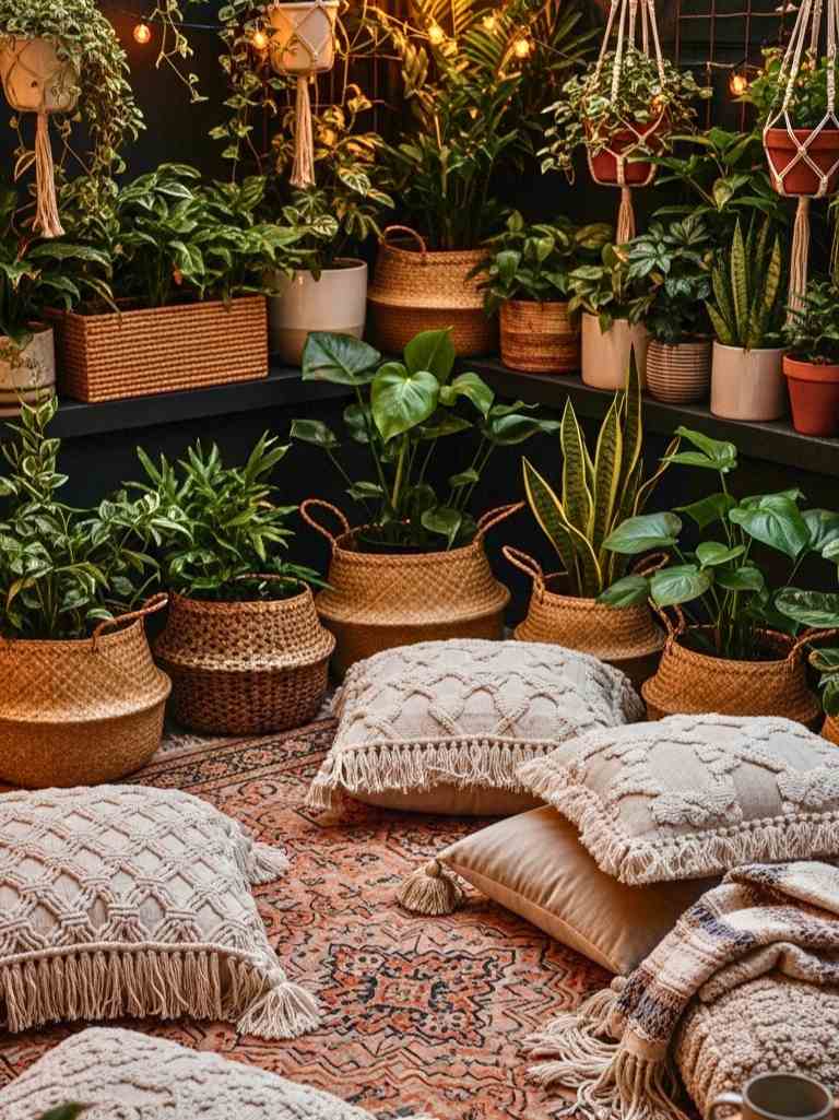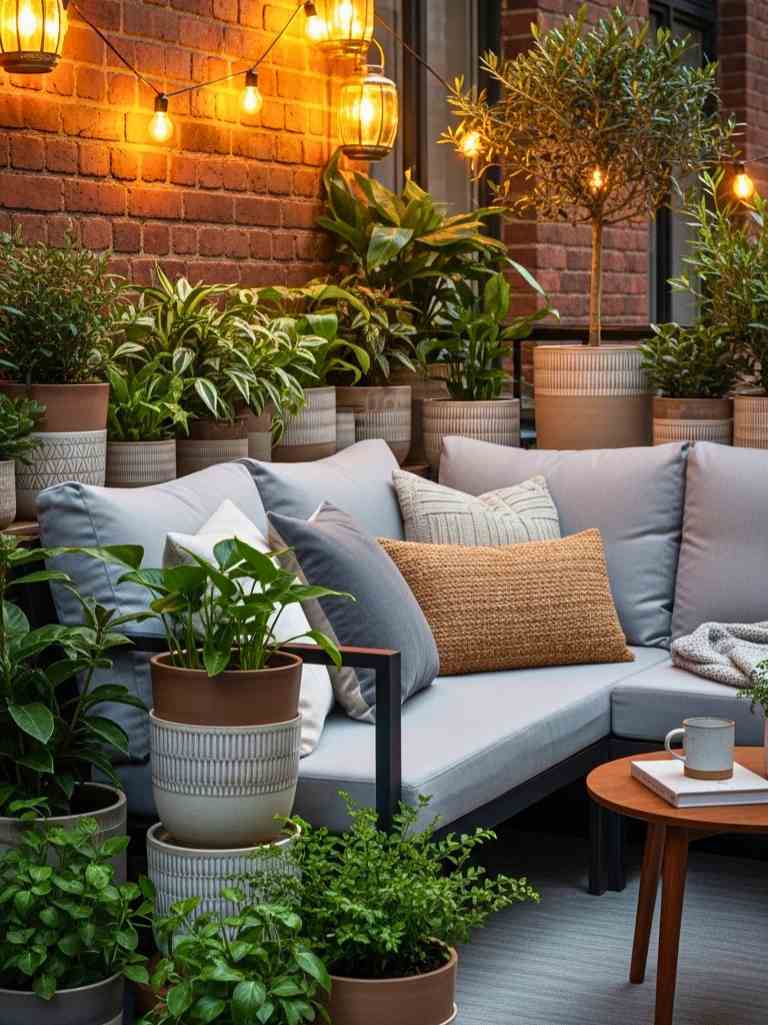 Surround the seating with layered container plants to create a cozy feel. I like adding herbs too. Mint, basil — they smell amazing and are useful.