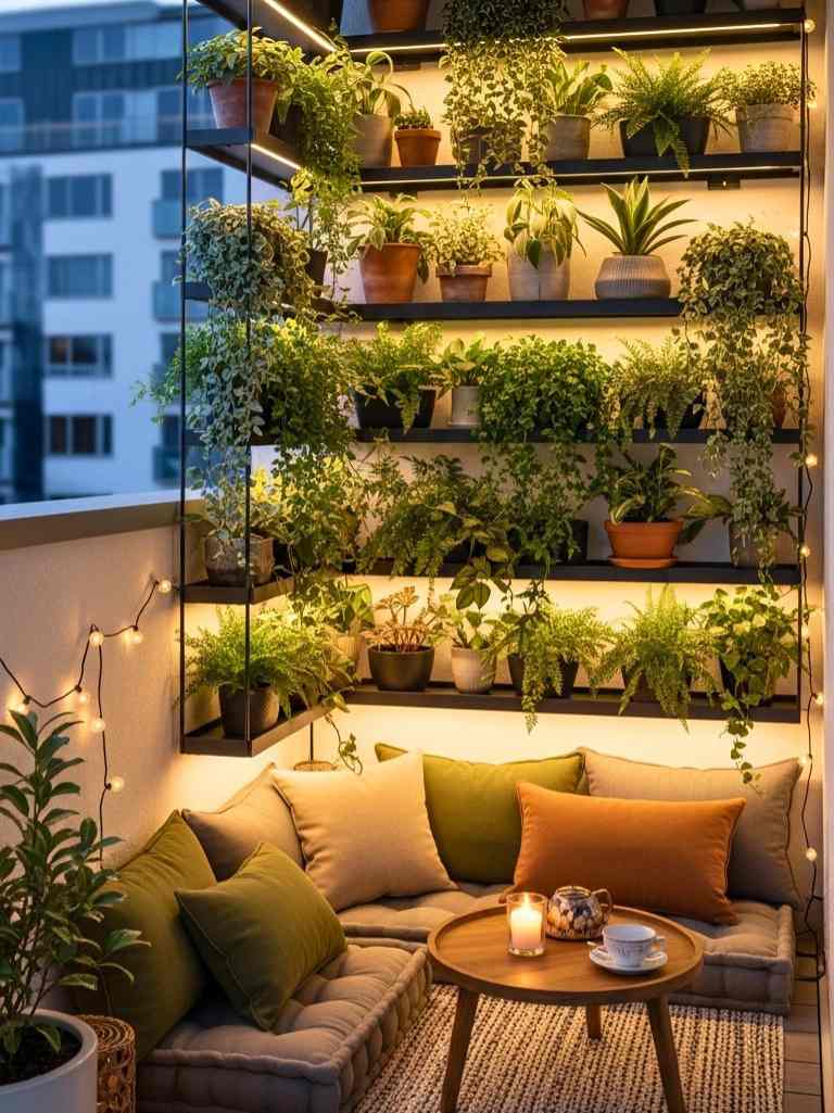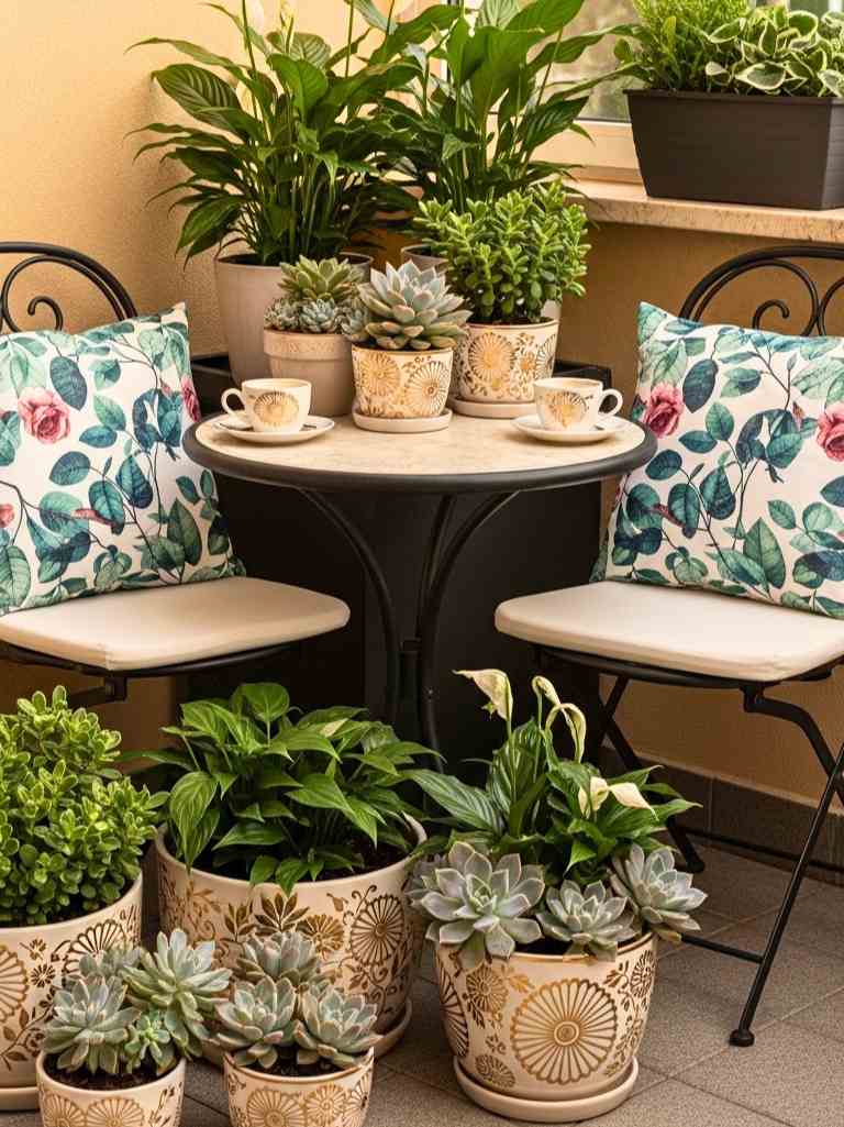This layering trick makes the space feel full without looking messy. I usually mix leafy greens with a few flowering plants. It keeps things fresh. You can even add a small side table for tea or coffee. This setup feels calm and personal. It’s perfect for slow mornings or quiet evenings.