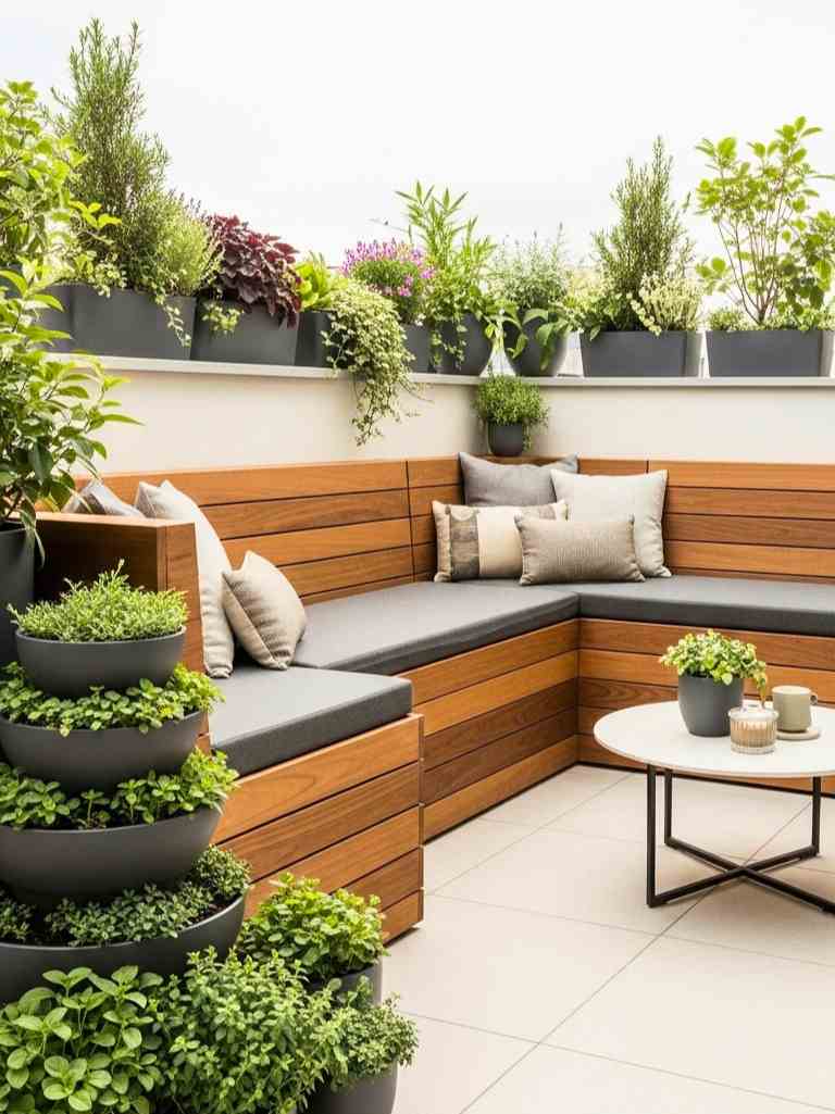 I love furniture that does more than one job. Built-in seating is perfect for small terraces. Create an L-shaped bench that fits exactly into your corner. Add hidden storage under the seats. You can keep gardening tools or extra cushions there.