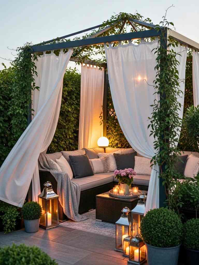 If you want a slightly luxe feel, go for a small pergola in the corner. It doesn’t have to be big. Even a compact frame works. Add light curtains to create privacy and shade.